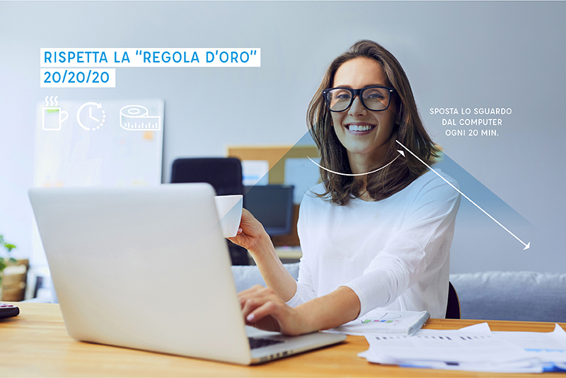 - rispettare la “REGOLA D’ORO” del 20/20/20, ogni 20 minuti alza lo sguardo dal pc per 20 secondi e osserva ad una distanza di almeno 20 metri; la cosa migliore sarebbe affacciarsi dalla finestra.