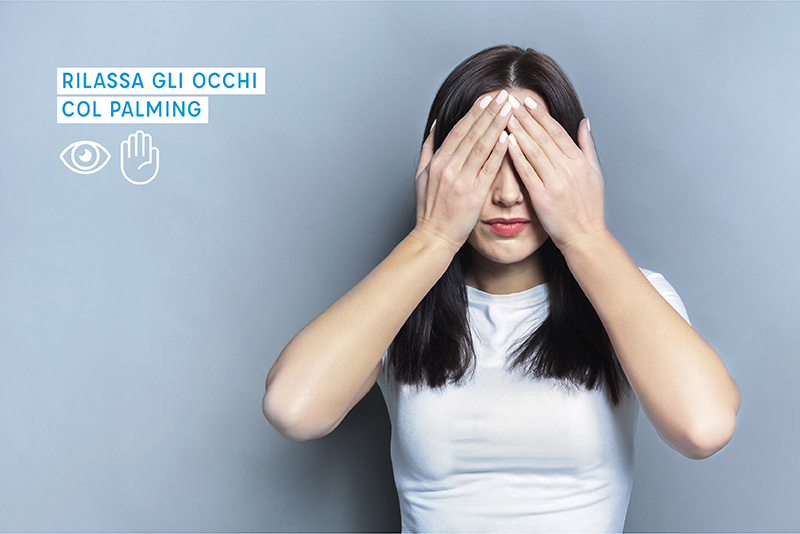 - quando il fastidio è importante si possono coprire gli occhi con le mani (palming) per qualche istante, senza toccarli, e, se è possibile, rinfrescarli (esistono mascherine apposta da tenere in frigo oppure un utile rimedio fai da te è mettere uno straccio nel frigo e applicarlo –delicatamente- sopra gli occhi).