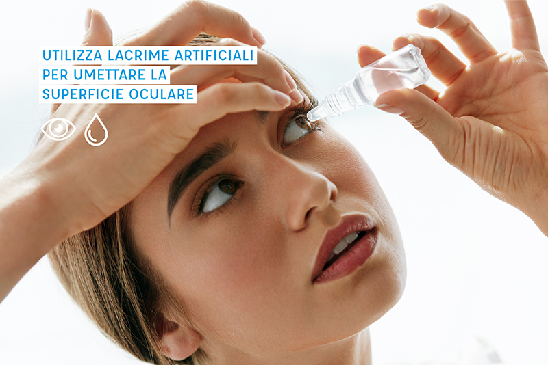 - utilizzare lacrime artificiali per umettare la superficie oculare: l’attenzione al pc ci porta a ridurre il numero di ammiccamenti al minuto e quindi alla disidratazione. Battere le palpebre infatti assicura una corretta lubrificazione ed idratazione del segmento anteriore.