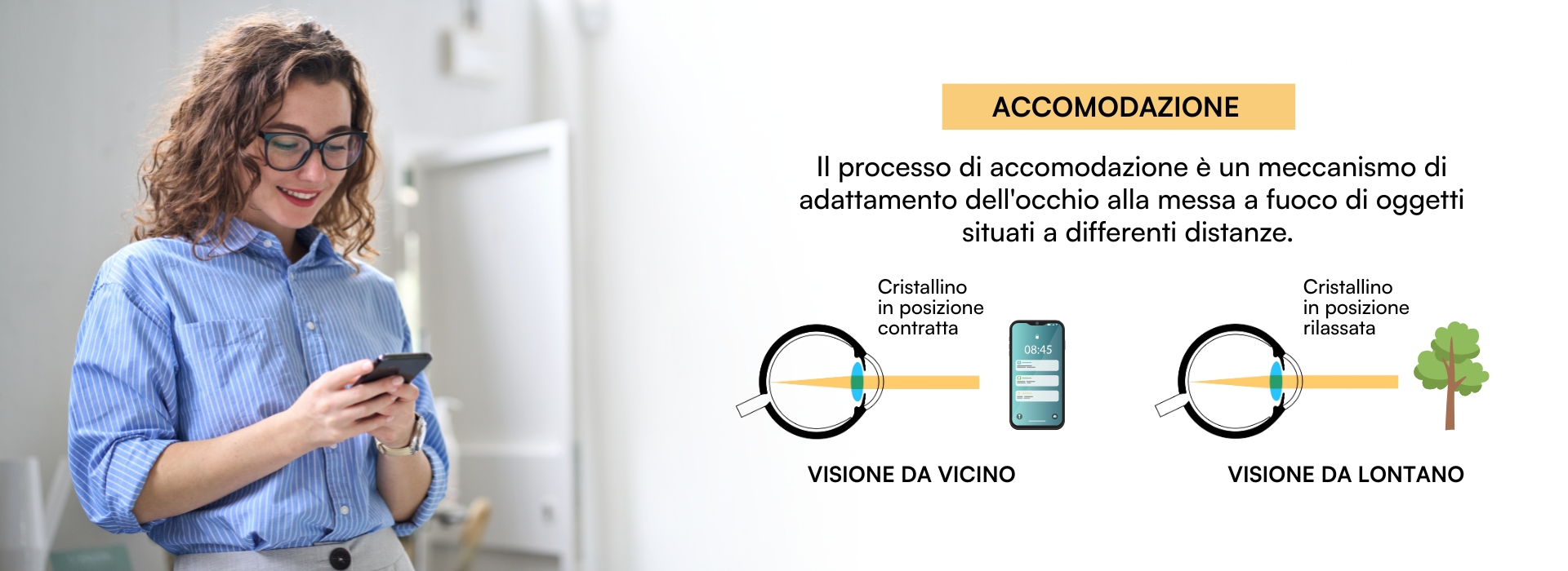 Infatti, il nostro occhio, per vedere nitidamente a distanze ravvicinate (circa entro 1 metro), deve aggiustare la “messa a fuoco” tramite l’uso del cristallino, contraendolo. Questo processo si chiama “accomodazione”.