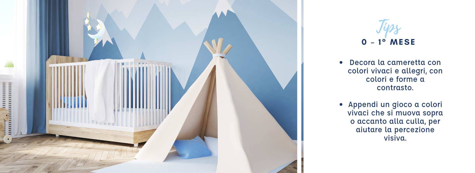 Il primo consiglio che ti diamo, per il primo mese di vita, è di decorare la sua stanza con colori vivaci e allegri, con colori e forme a contrasto, e appendere un gioco a colori vivaci che si muova sopra o accanto alla culla, per aiutare la sua percezione visiva.