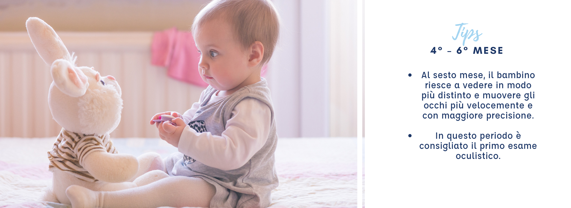 Il sesto mese rappresenta un importante momento perché è in questo periodo che il vostro bambino dovrebbe fare il suo primo esame oculistico. Il vostro pediatra vi supporterà in tal senso.