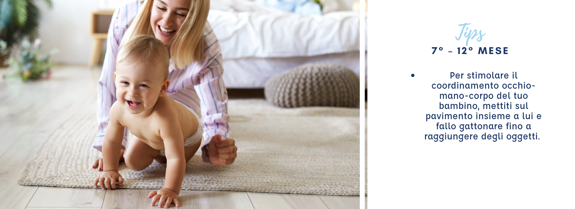 Consiglio: Per stimolare il coordinamento occhio-mano-corpo del tuo bambino, mettiti sul pavimento insieme a lui e fallo gattonare fino a raggiungere degli oggetti.