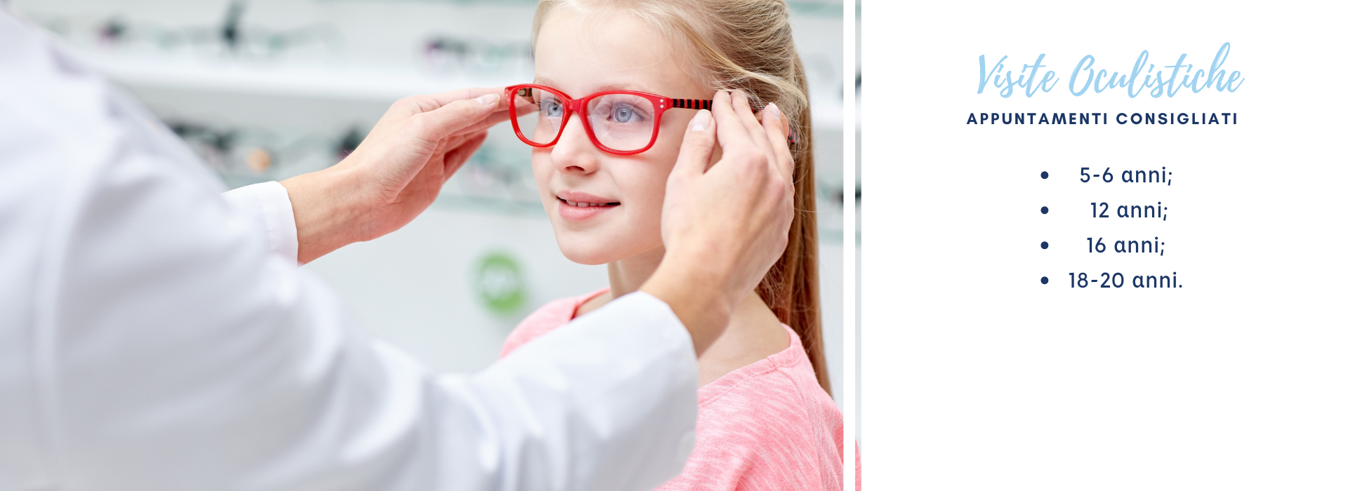 Le visite oculistiche che suggeriamo di effettuare sono: prima dell’inizio della scuola (5-6 anni), ai 12 anni, e poi 16 e 18-20 anni (quando l’occhio termina la sua crescita fisiologica).