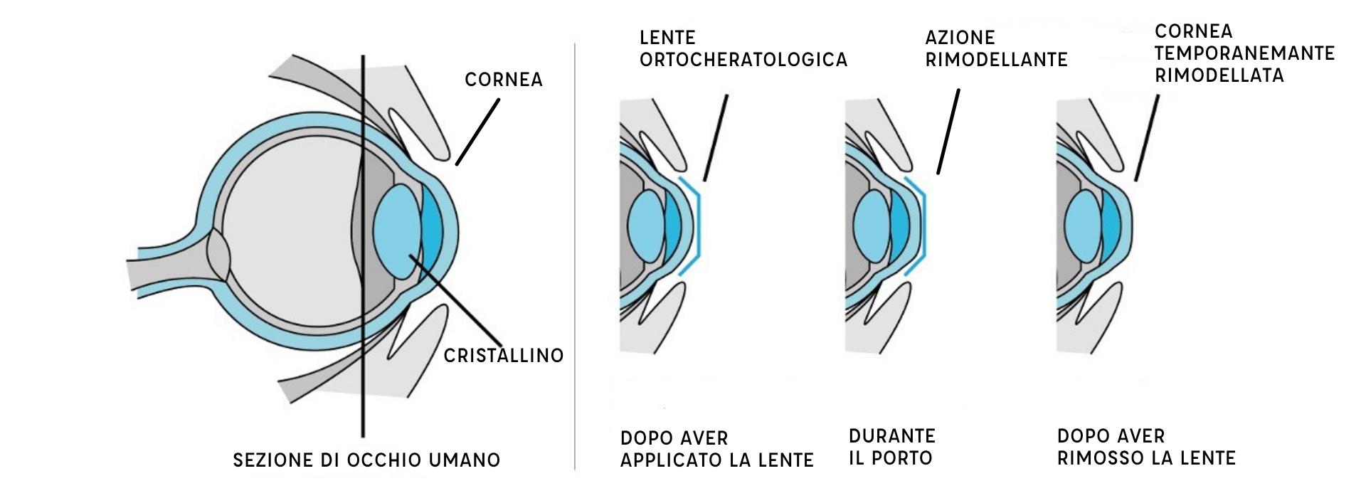 Le lenti vengono studiate e costruite con una geometria speciale, specifica, “sartoriale” per ogni occhio, in grado di modificare la curvatura ed il profilo della cornea (parte trasparente dell’occhio davanti all’iride), in relazione al difetto visivo da correggere. Come accennato nelle precedenti “puntate”, la maggior parte dei difetti visivi come la miopia e l’ipermetropia derivano dalla curvatura della cornea. Ad esempio, per la correzione della miopia, anche associata ad astigmatismo, le lenti orto-k appiattiranno la cornea nella zona centrale, mentre per la correzione dell’ipermetropia aumenteranno la curva della cornea sempre nella porzione centrale.