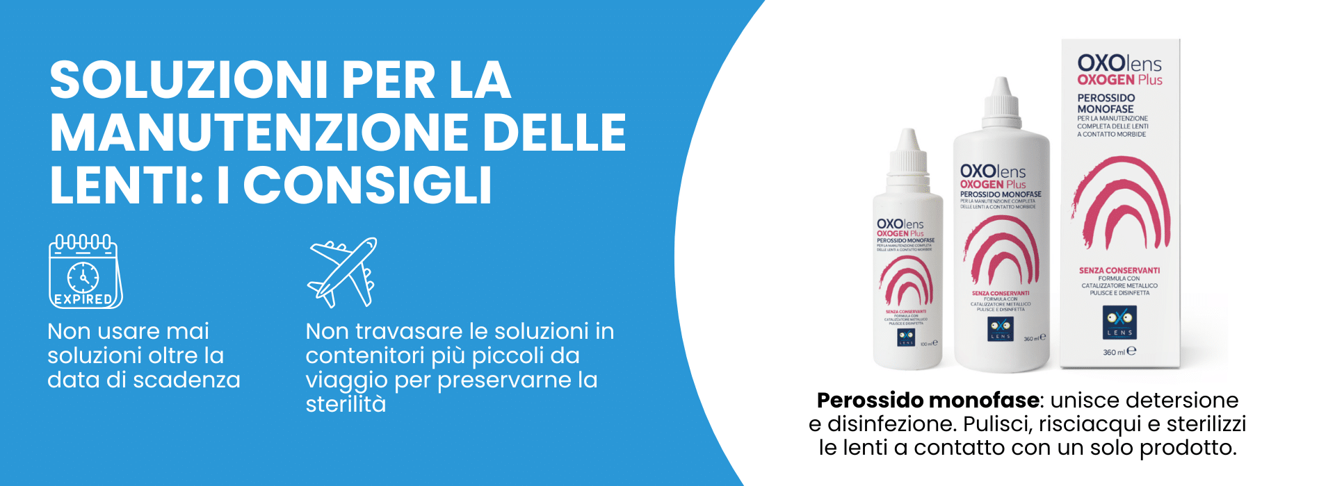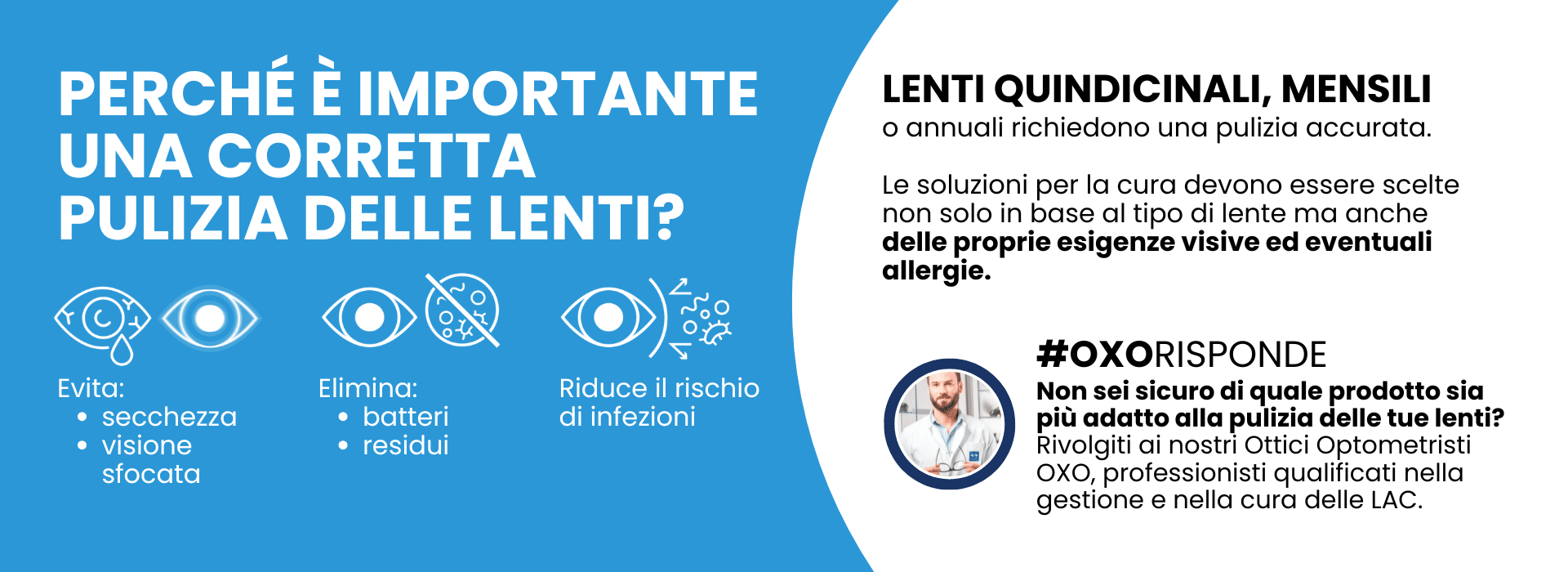 Per la pulizia delle lenti, utilizza sempre una dose nuova e pulita di soluzione disinfettante specifica, come le soluzioni OXOLens.