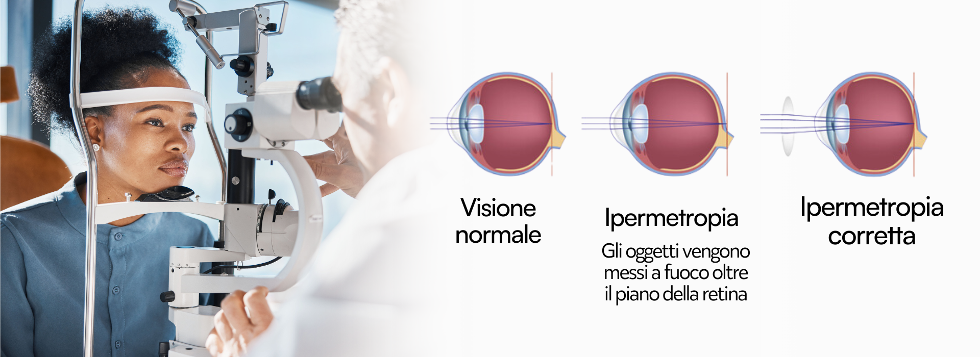 In presenza di miopia il bulbo è più allungato rispetto alla norma ed ha una curvatura corneale più “ripida” ed acuta, ma in caso di ipermetropia la condizione si capovolge, il bulbo è più ristretto rispetto alla norma e/o la cornea è più “piatta”.