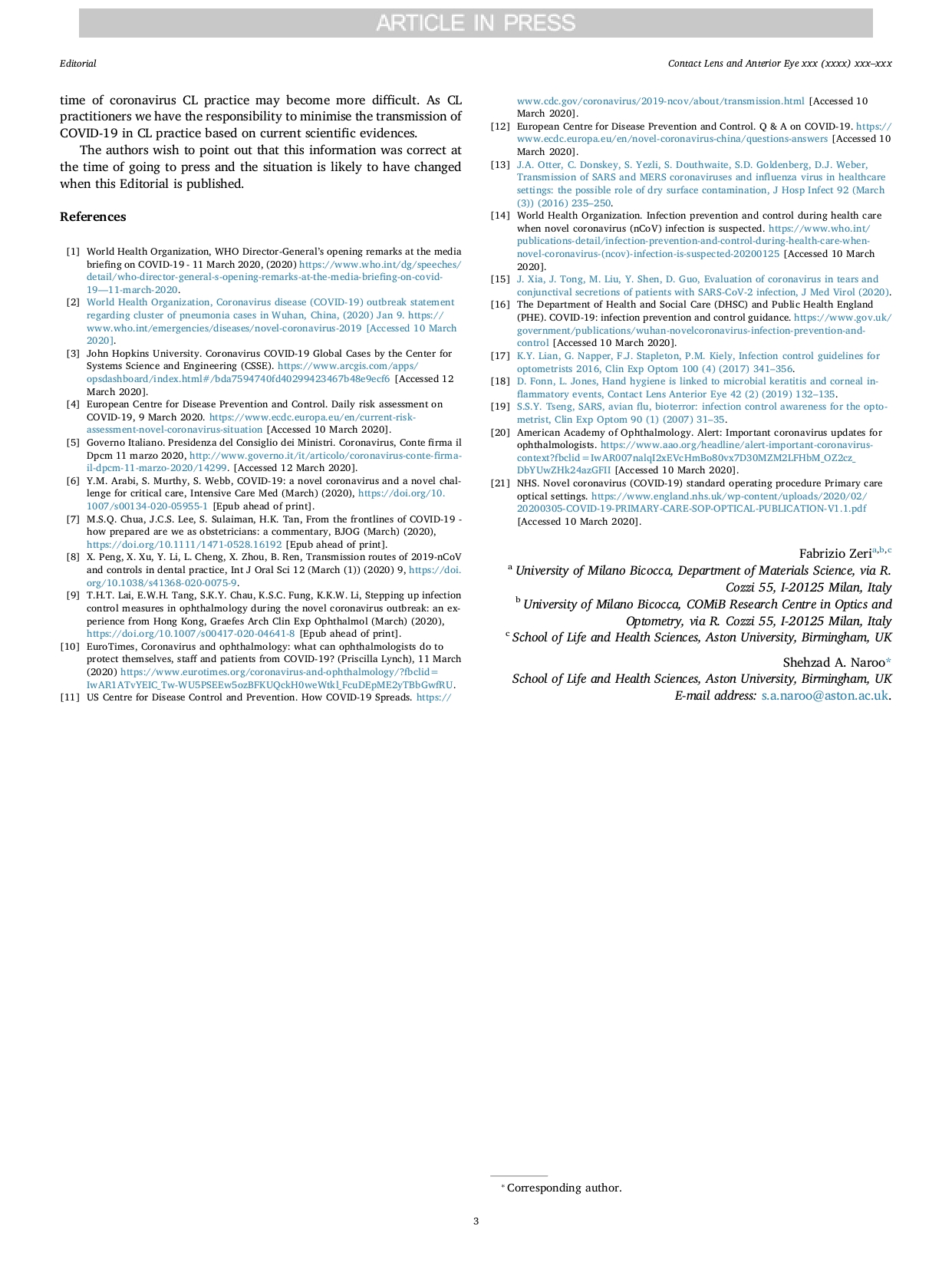 University of Milano Bicocca, Department of Materials Science, via R. Cozzi 55, I-20125 Milan, Italy b University of Milano Bicocca, COMiB Research Centre in Optics and Optometry, via R. Cozzi 55, I-20125 Milan, Italy c School of Life and Health Sciences, Aston University, Birmingham, UK Shehzad A. Naroo* School of Life and Health Sciences, Aston University, Birmingham, UK E-mail address: s.a.naroo@aston.ac.uk.