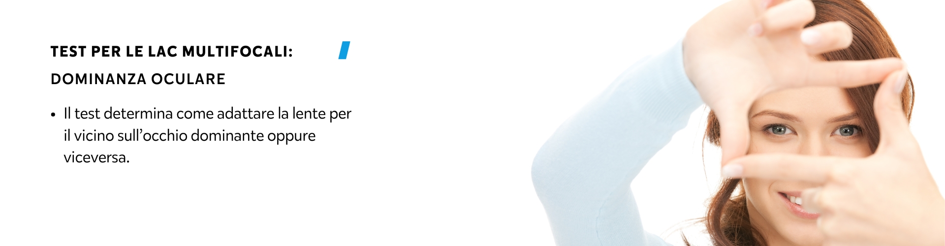 Un altro test effettuato per le lenti a contatto multifocali è la dominanza oculare. Conoscendo la dominanza motoria e sensoriale del nostro occhio (per approfondire, leggi qui), possiamo provare lenti per presbiopia a geometria (o design) “alternata”: una lente corregge la visione da vicino e l’altra quella da lontano. In base ai dati del test, si deciderà come adattare le lenti, ad esempio indossando la lente per il vicino sull’occhio dominante oppure viceversa.