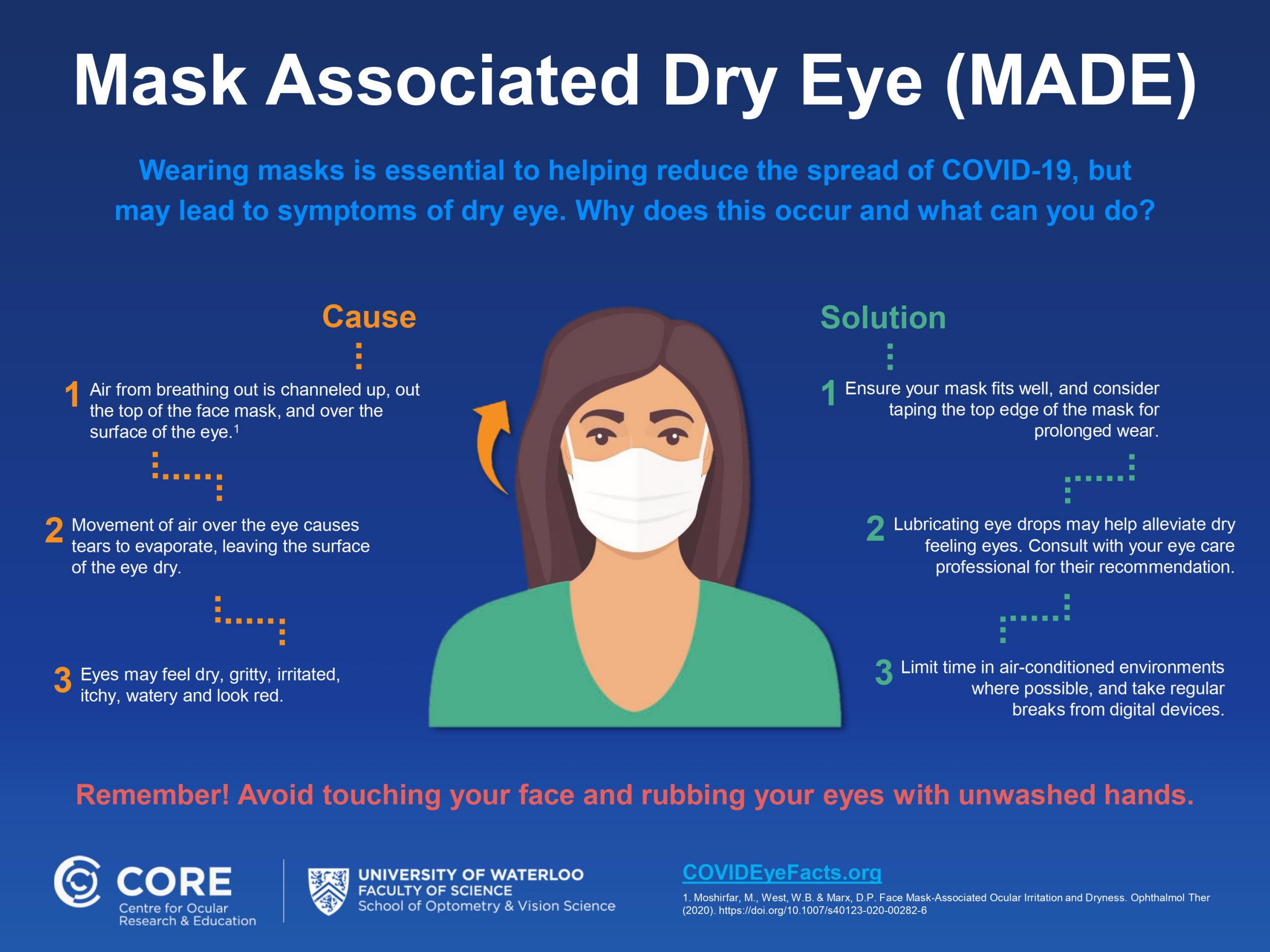 Una ricerca pubblicata a settembre 2020, condotta dal Centre for Ocular Research & Education (CORE) presso la School of Optometry and Vision Science dell’Università di Waterloo in Canada, ha evidenziato un significativo aumento dei sintomi dell’occhio secco tra chi indossa abitualmente la mascherina.
