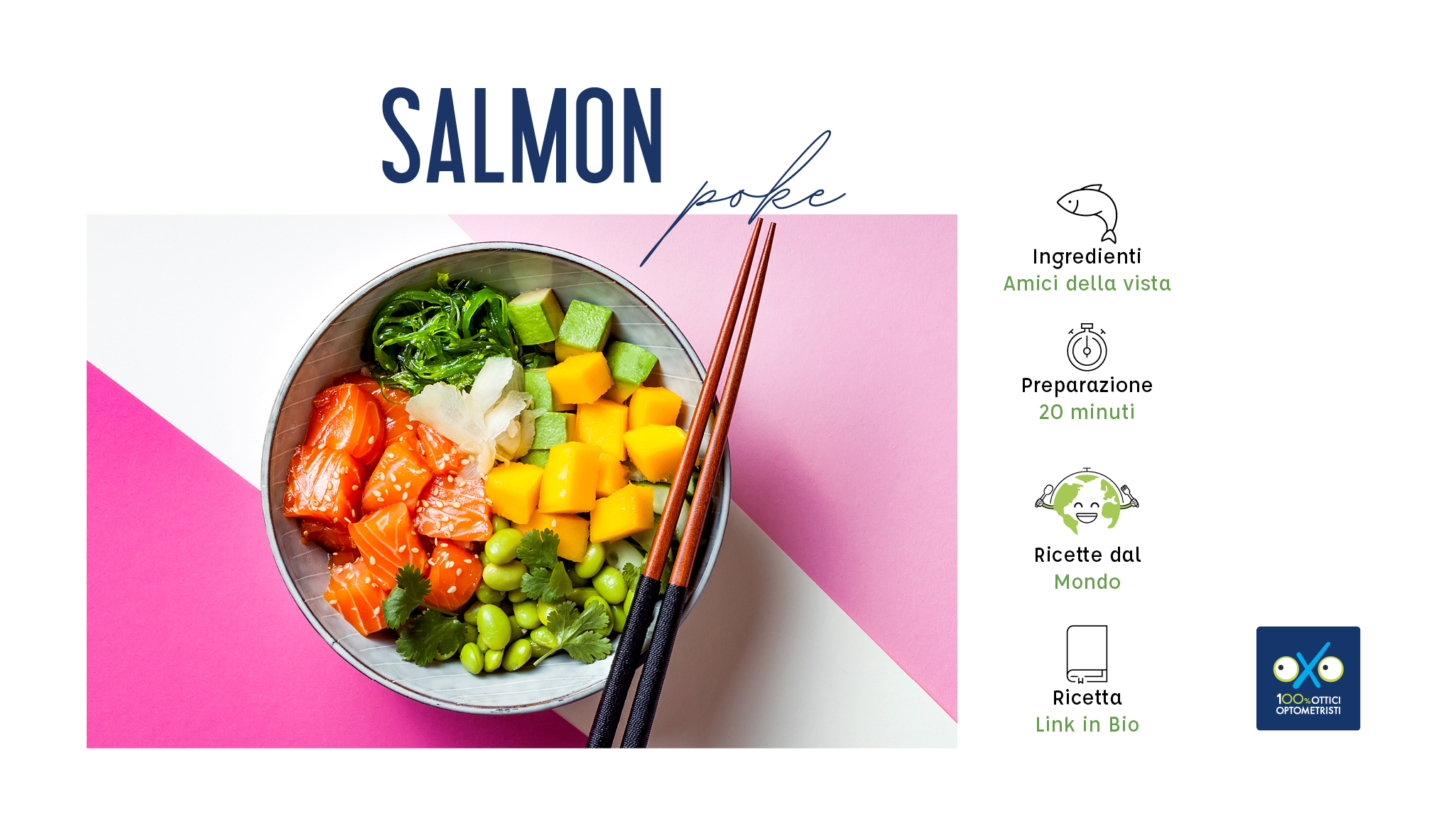 Per chi non avesse idea di cosa sia una poké bowl, si tratta di una ciotola (bowl) servita con ingredienti tagliati a cubetti (poké) a scelta tra pesce, frutta, verdura e condita con salse a piacimento. Ci sono tantissime ricette, noi vi proponiamo una versione classica, con preziosi ingredienti amici della vista.