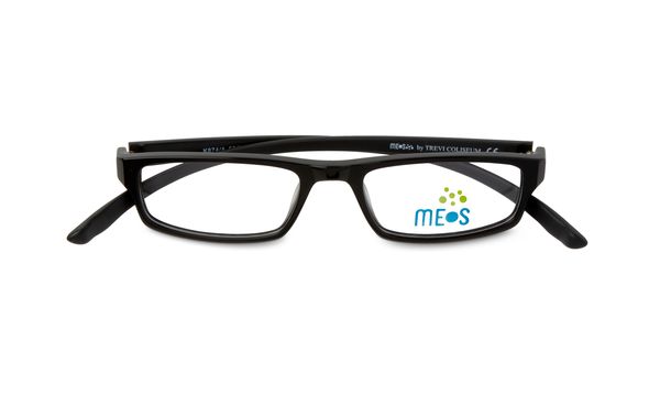 Occhiali da lettura in plastica a forma rettangolare con aste estremamente curvate.
