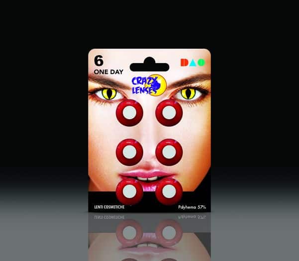 Lenti a contatto cosmetiche “Crazy Red” a ricambio giornaliero, da gettare al termine dell’uso.