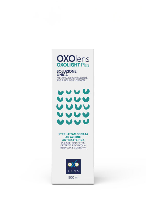 Oxolens Oxolight Plus è la soluzione unica ad azione batterica che pulisce, disinfetta, risciacqua, deterge, reidrata e conserva tutte le lenti a contatto morbide, anche silicone hydrogel.