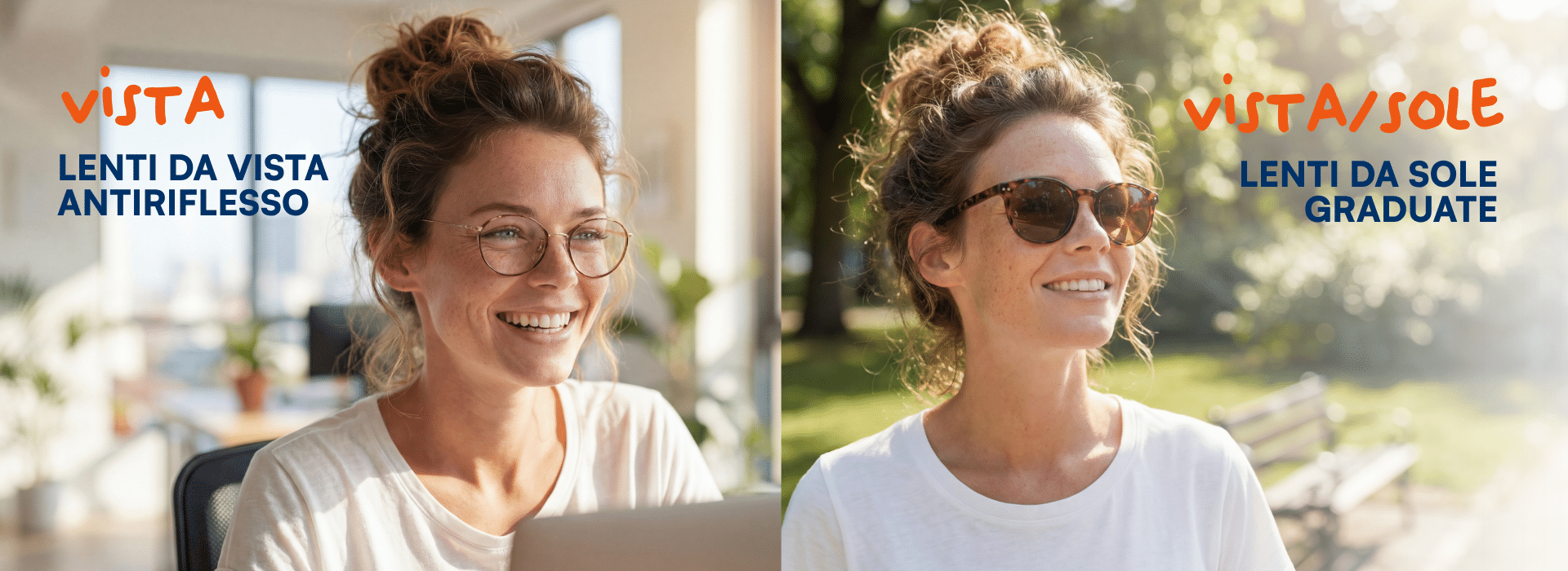 Acquistando gli occhiali da vista con lenti monofocali o progressive con trattamento antiriflesso, con soli €5* ricevi una coppia di lenti da sole graduate (con la tua correzione visiva).
