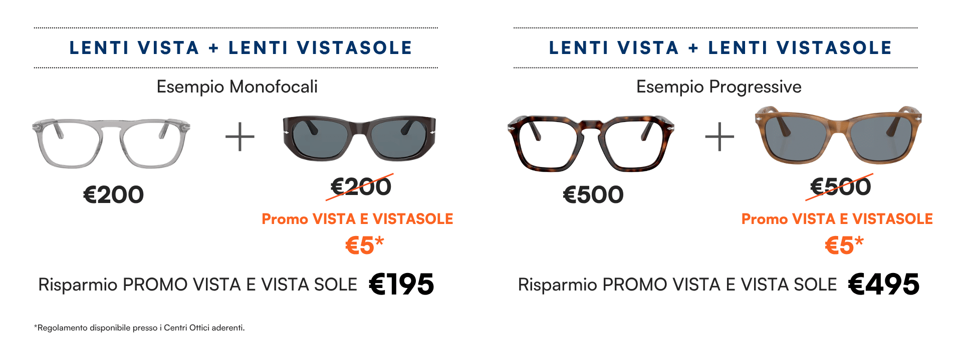 Risparmio garantito: VISTA E VISTASOLE è la promozione che ti offre due occhiali con la tua correzione al valore di uno.
