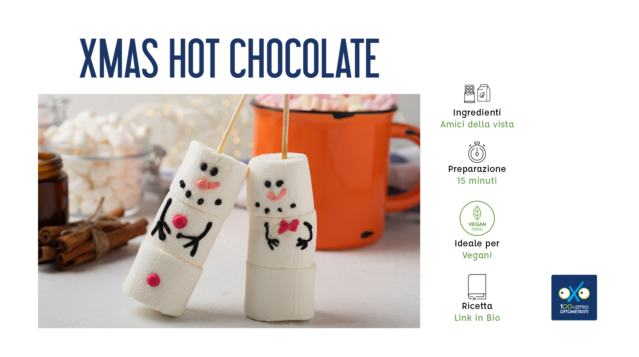 Una tazza di cioccolata calda è il piacere che scalda l’inverno. Oggi te la proponiamo in una versione super natalizia che farà impazzire i più piccoli: cioccolata calda con latte di mandorle e simpaticissimi pupazzi di neve di marshmallow.